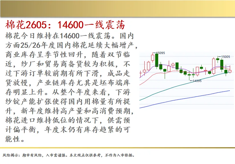 棉花今日维持在14600一线震荡。国内方面25/26年度国内棉花延续大幅增产,商业库存呈季节性回升,随着双节临近,纱厂和贸易商备货较为积极,不过下游订单较前期有所下滑,成品走货放慢,产业链库存尤其是坯布端库存明显上升。从整个年度来看,下游纱锭产能扩张使得国内用棉量有所提升,新年度维持高产量和高消费预期,棉花进口维持低位的情况下,供需预计偏平衡,年度末仍有库存趋紧的可能性。