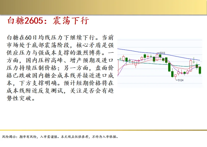 白糖在60日均线压力下继续下行。当前市场处于底部震荡阶段,核心矛盾是强供应压力与强成本支撑的激烈博弈。一方面,国内压榨高峰、增产预期及进口压力持续压制价格;另一方面,盘面价格已跌破国内糖企成本线并接近进口成本,下方支撑明确。预计短期价格将在成本线附近反复测试,关注是否会有趋势性突破。