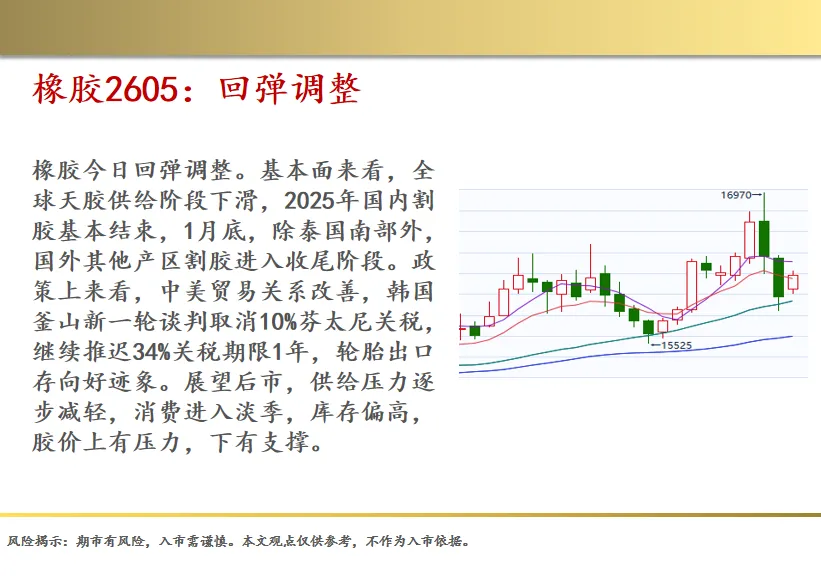 橡胶今日回弹调整。基本面来看,全球天胶供给阶段下滑,2025年国内割胶基本结束,1月底,除泰国南部外,国外其他产区割胶进入收尾阶段。政策上来看,中美贸易关系改善,韩国釜山新一轮谈判取消10%芬太尼关税,继续推迟34%关税期限1年,轮胎出口存向好迹象。展望后市,供给压力逐步减轻,消费进入淡季,库存偏高,胶价上有压力,下有支撑。