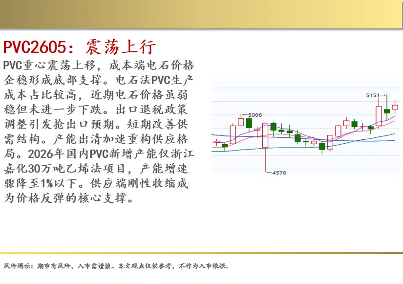 PVC重心震荡上移,成本端电石价格企稳形成底部支撑。电石法PVC生产成本占比较高,近期电石价格虽弱稳但未进一步下跌。出口退税政策调整引发抢出口预期。短期改善供需结构。产能出清加速重构供应格局。2026年国内PVC新增产能仅浙江嘉化30万吨乙烯法项目,产能增速骤降至1%以下。供应端刚性收缩成为价格反弹的核心支撑。