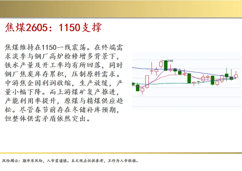 焦煤维持在1150一线震荡。在终端需求淡季与钢厂高炉检修增多背景下,铁水产量及开工率均有所回落,同时钢厂焦炭库存累积,压制原料需求。中游焦企因利润收缩,生产放缓,产量小幅下降。而上游煤矿复产推进,产能利用率提升,原煤与精煤供应趋松。尽管春节前存在冬储补库预期,但整体供需矛盾依然突出。