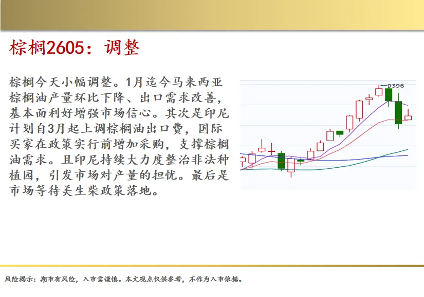 棕榈今天小幅调整。1月迄今马来西亚棕榈油产量环比下降、出口需求改善,基本面利好增强市场信心。其次是印尼计划自3月起上调棕榈油出口费,国际买家在政策实行前增加采购,支撑棕榈油需求。且印尼持续大力度整治非法种植园,引发市场对产量的担忧。最后是市场等待美生柴政策落地。