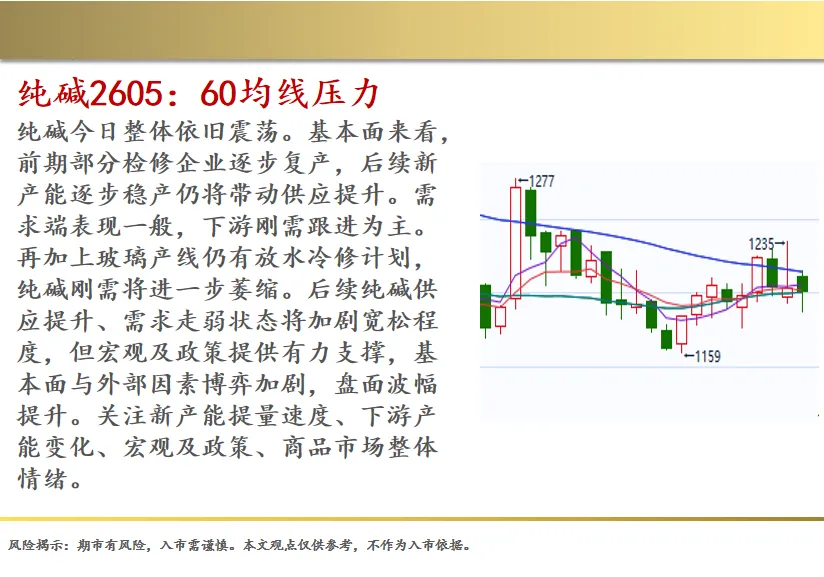 纯碱今日整体依旧震荡。基本面来看,前期部分检修企业逐步复产,后续新产能逐步稳产仍将带动供应提升。需求端表现一般,下游刚需跟进为主。再加上玻璃产线仍有放水冷修计划,纯碱刚需将进一步萎缩。后续纯碱供应提升、需求走弱状态将加剧宽松程度,但宏观及政策提供有力支撑,基本面与外部因素博弈加剧,盘面波幅提升。关注新产能提量速度、下游产能变化、宏观及政策、商品市场整体情绪。