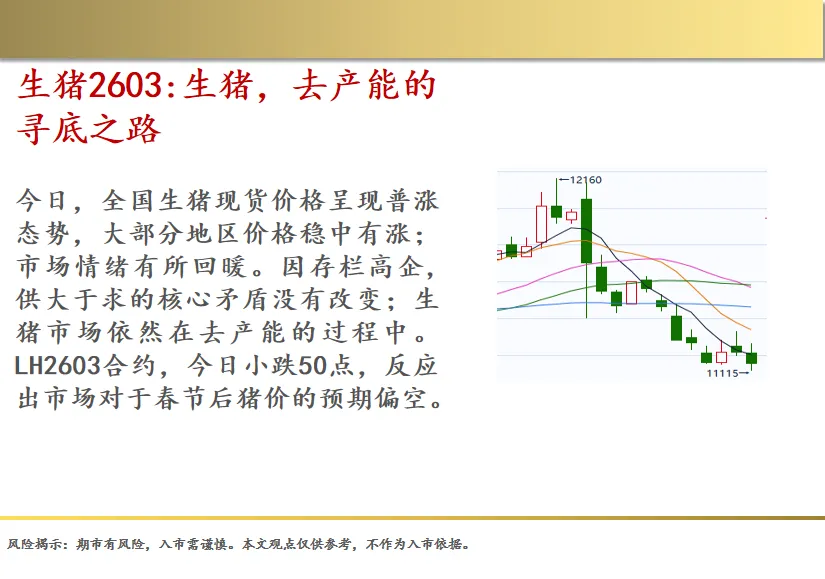 今日,全国生猪现货价格呈现普涨态势,大部分地区价格稳中有涨;市场情绪有所回暖。因存栏高企,供大于求的核心矛盾没有改变;生猪市场依然在去产能的过程中。LH2603合约,今日小跌50点,反应出市场对于春节后猪价的预期偏空。