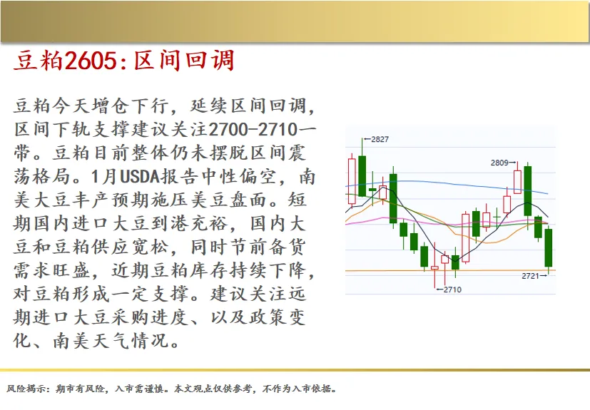 豆粕今天增仓下行,延续区间回调,区间下轨支撑建议关注2700-2710一带。豆粕目前整体仍未摆脱区间震荡格局。1月USDA报告中性偏空,南美大豆丰产预期施压美豆盘面。短期国内进口大豆到港充裕,国内大豆和豆粕供应宽松,同时节前备货需求旺盛,近期豆粕库存持续下降,对豆粕形成一定支撑。建议关注远期进口大豆采购进度、以及政策变化、南美天气情况。