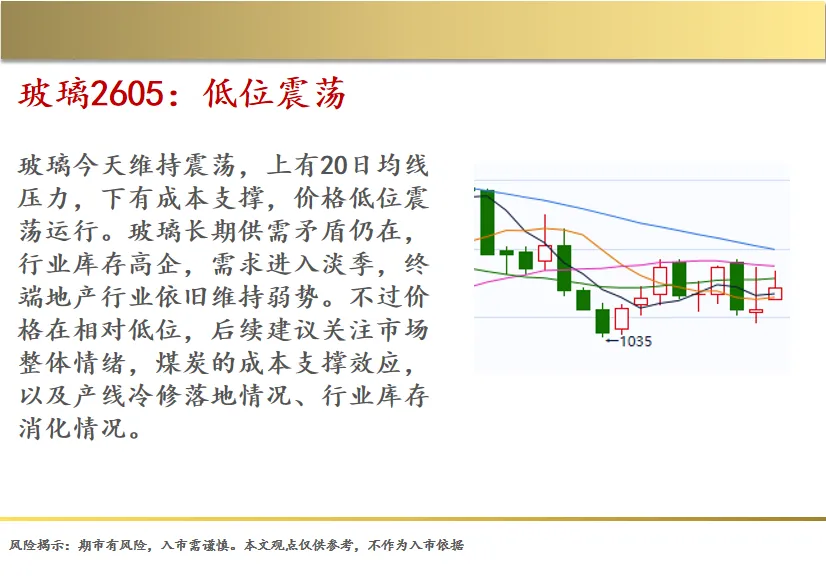 玻璃今天维持震荡,上有20日均线压力,下有成本支撑,价格低位震荡运行。玻璃长期供需矛盾仍在,行业库存高企,需求进入淡季,终端地产行业依旧维持弱势。不过价格在相对低位,后续建议关注市场整体情绪,煤炭的成本支撑效应,以及产线冷修落地情况、行业库存消化情况。