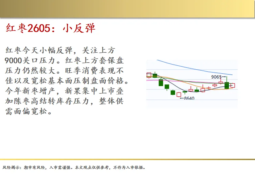 红枣今天小幅反弹,关注上方9000关口压力。红枣上方套保盘压力仍然较大。旺季消费表现不佳以及宽松基本面压制盘面价格。今年新枣增产,新果集中上市叠加陈枣高结转库存压力,整体供需面偏宽松。