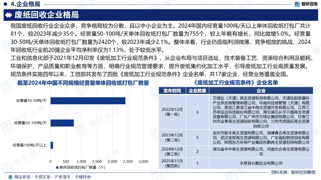 废纸回收是指将废弃的纸张进行收集、分类、处理和再生利用的一种环保行为,包括纸箱、纸板、报纸、书本、纸张、信封、广告单、快递包装盒等。废纸是我国造纸产业的第一大原料来源,具有可循环、环保、低碳等多重属性,是推动中国造纸工业绿色高质量发展的重要支撑。据中再生协会废纸分会统计,2022-2023年,国内回收纸回收量与交易额出现回调,2024年迎来反弹,回收量为2020年以来新高,达6797万吨,较2023年同比上涨9.1%;市场交易额为1055.2亿元,较2023年同比增长6.4%。2025年前三季度国内废纸回收量达5290万吨,同比上涨3.4%。2022-2024年期间,供过于求的局面导致回收纸价格不断下跌,2024年回收纸平均价格为1552.4元/吨,较2021年减少了898.6元/吨。细分来看,2024年我国回收纸价格指数呈现探底恢复的U型态势。其中一季度价格指数跌幅较大,二季度在低位徘徊,三、四季度逐步上升,并在年末价格达到全年最高点。期间,最低价1470.23元/吨,最高价1700.8元/吨。我国废纸回收体系尚未完全建成,废纸回收量率仍较低,2024年我国废纸回收率为51.1%,废纸利用率为51.6%,远低于欧美地区,具备较大提升空间。我国废纸回收行业企业众多,竞争格局较为分散,且以中小企业为主。2024年国内经营量100吨/天以上单体回收纸打包厂共计81个,较2023年减少35个,同比下降30.2%。经营量50-100吨/天单体回收纸打包厂数量为755个,较上年略有增长,同比微增5.0%。经营量30-50吨/天单体回收纸打包厂数量为2420个,较2023年减少2.1%。整体来看,行业仍面临利润微薄、竞争粗放的挑战,2024年回收纸行业前20强企业平均净利率仅为1.13%,处于较低水平。未来,在智能升级、全产业链协同与标准提升的共同驱动下,废纸回收行业有望逐步摆脱低效竞争,走向高质量、高附加值的发展新阶段。