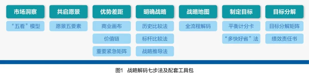 战略解码包括市场洞察、共启愿景、优势差距、明确战略、战略地图、制定目标、目标分解七个步骤。