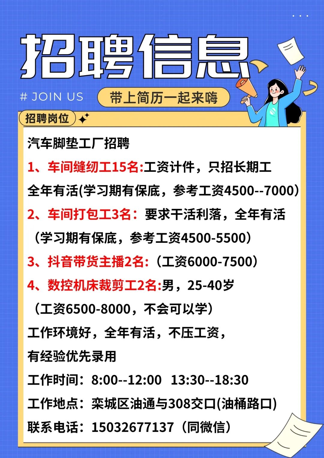 工作地点:栾城区油通与308交口(油桶路口)