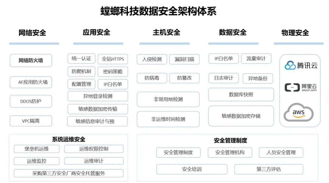 螳螂科技一直致力于为客户构建数据安全屏障,保障用户的数据安全和隐私保护。据白皮书显示,螳螂科技从信息安全保障、管理与组织、安全防护、安全监测、安全运行、应急恢复等维度,建立数据安全防护机制,为教育、医疗、家装等不同行业企业提供高标准的数据安全保障。