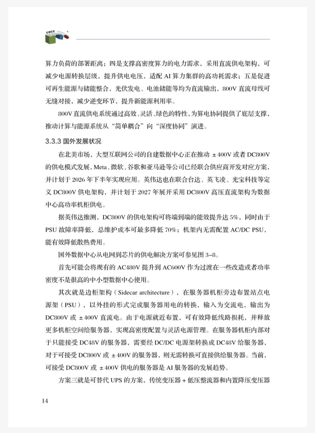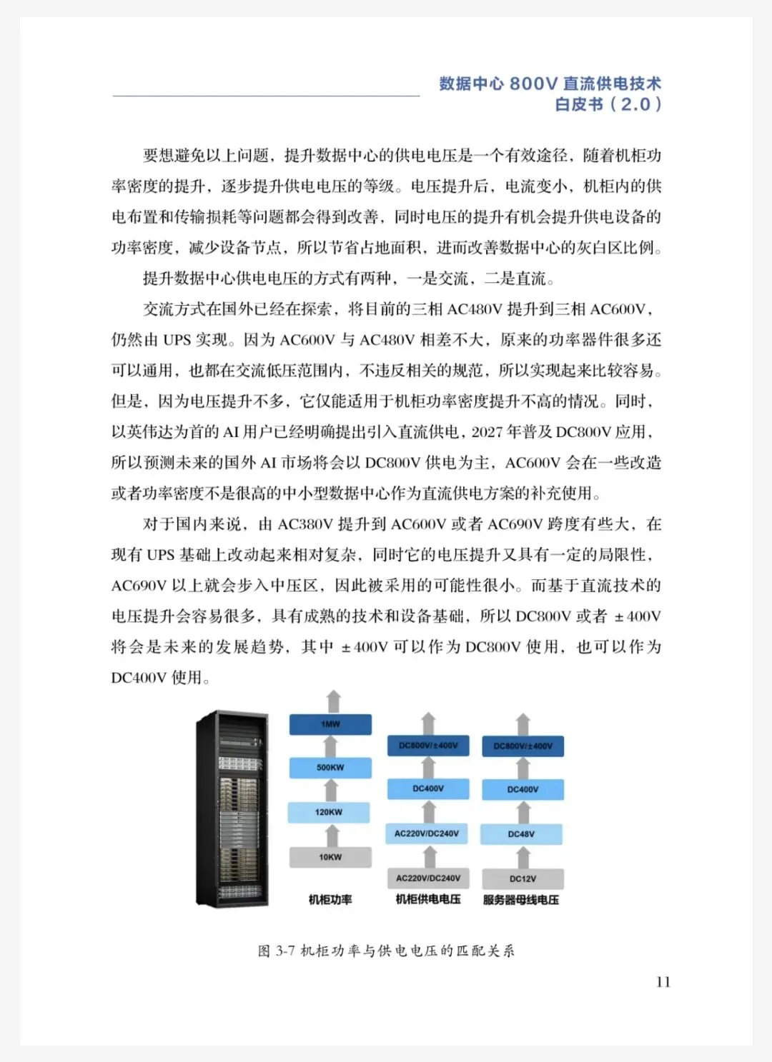 这是一篇关于数据中心800V直流供电技术的白皮书,主要介绍了数据中心供电系统的发展历程、800V直流供电系统的适配性分析、工作原理和关键技术,以及未来发展方向。以下是对这些核心内容的简要概述: ◈ 交流供电系统:传统数据中心供电系统包括AC10kV配电、变电、UPS等,设备多、效率低。预制化电力模块设备提高了建设速度和效率,但仍有局限。 ◈ 直流供电系统:高压直流(HVDC)供电系统发展自电信行业,电压等级提升至DC240V或DC336V。10kV交流输入的直流不间断电源系统进一步集成,体积更小、效率更高。 ◈ 技术演进:随着IT机柜功率密度提升,供电电压需提升。国外探索AC600V,国内倾向DC800V或±400V。SST电源系统是发展方向,具有高效率、低谐波等优势。 ◈ 电子信息设备:服务器设备需从AC220V或DC240V转DC48V,DC800V或±400V供电可减少转换环节,节省空间。◈ 暖通设备:电机、变频器、电动阀门等需升级以适应DC800V或±400V供电。过渡期可加装逆变器或继续使用交流UPS。◈ 照明设备:DC800V直流智慧照明系统已广泛应用,可实现电源整合,提高效率。◈ 其它设备:监控、消防等设备的电源模块需替换为DC800/400V转DC24/12V。◈ 实现方式:三种技术路线,包括常规变压器、移相变压器和固态变压器(SST)。SST具有更少的电压转换环节,效率更高。◈ 系统架构:2N架构、分布式冗余系统(DR架构)和后备式冗余系统(RR架构)。RR架构负载率高,投资低,是主要演进方向。◈ 蓄电池接入:电池直挂方案在800V系统中不适用,需经DC/DC接入。飞轮储能系统(FESS)可缓解瞬态波动,提供短时间备电。◈ 新能源接入:光伏和储能系统可通过双向直流变换器接入800V直流母线,实现新能源的高比例接入。◈ 电源特性:直流供电系统电源供给点多,短路电流路径复杂,需专用直流保护器件。◈ 故障特性:短路限流型、自保护型、失控型和电池直挂型电源系统各有不同的短路电流特性。◈ 保护方案:根据电源特性配置熔断器、机械式断路器或固态断路器,实现选择性保护配合。◈ 绝缘与绝缘监测:设备需满足绝缘要求,系统需进行绝缘监测,避免漏电和绝缘击穿。◈ 高阻接地:限制单点对地短路电流,但需配置故障检测系统。◈ 直接接地:中性点直接接PE,易于故障定位,但存在电击和短路电流风险。◈ 悬浮不接地:对两极绝缘要求高,人体触碰不会触电,但需高绝缘设计。◈ 电源设备:高压直流电源(HVDC)、直流不间断电源(DC UPS)和SST电源。SST效率高、体积小,但成本高且可靠性待检验。◈ 直流静态转换开关(DC STS):实现毫秒级电源切换,保障关键负载高可用性。◈ 直流电缆:需具备高导电率、低阻抗、耐火阻燃等特性,优选单芯电缆。◈ 直流母线:基于交流母线设计,需考虑电气性能、机械性能、安全性能和环境适应性。◈ 交流用户切入直流供电系统:当负载功率密度达到单机柜500kW或经济性不占优势时,需考虑切换到高压直流供电系统。◈ 未来发展方向:随着算力增长,DC800V或±400V供电系统将普及,配套设施也将逐步直流化,新能源系统将更多导入数据中心,供电架构将向DR或RR架构转变。这篇文章为数据中心供电系统的未来发展提供了技术指引,通过详细分析800V直流供电系统的优势和应用前景,展示了其在高功率密度数据中心中的潜力和必要性。 如本文对你有用,欢迎留言、点赞、转发!!!