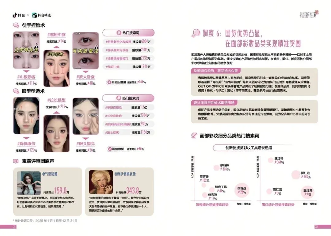 国货品牌还通过创新便携类彩妆工具,满足了消费者在不同场景下的使用需求。数据显示,修容棒、腮红液、修容膏等细分品类的搜索量同比上升显著,消费者对便捷、高效的彩妆工具需求旺盛。