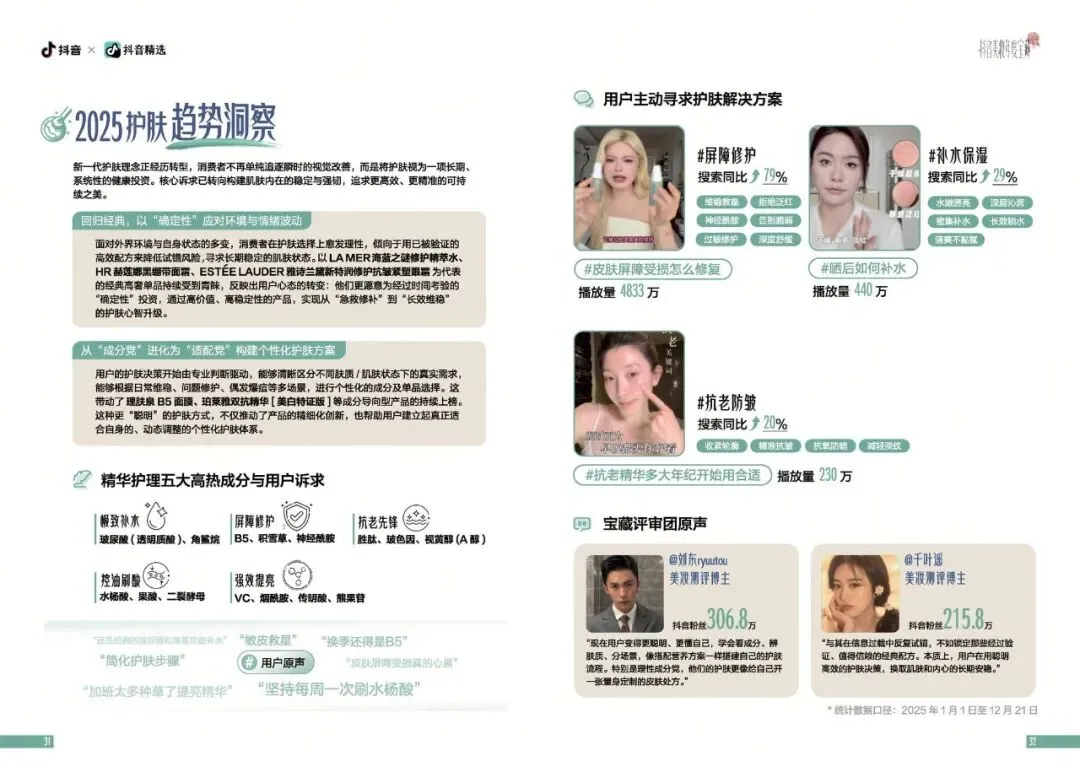 在护肤领域,2025年呈现出从“成分党”到“适配党”的转变。消费者不再盲目追求热门成分,而是更加注重成分与自身肤质的适配性。调研显示,用户在选择护肤产品时,会根据不同的肤质、季节以及肌肤状态,进行个性化的成分及单品选择。敏感肌用户更倾向于选择含有B5、积雪草、神经酰胺等成分的产品,而抗老需求的用户则偏好胜肽、玻色因、视黄醇等成分。