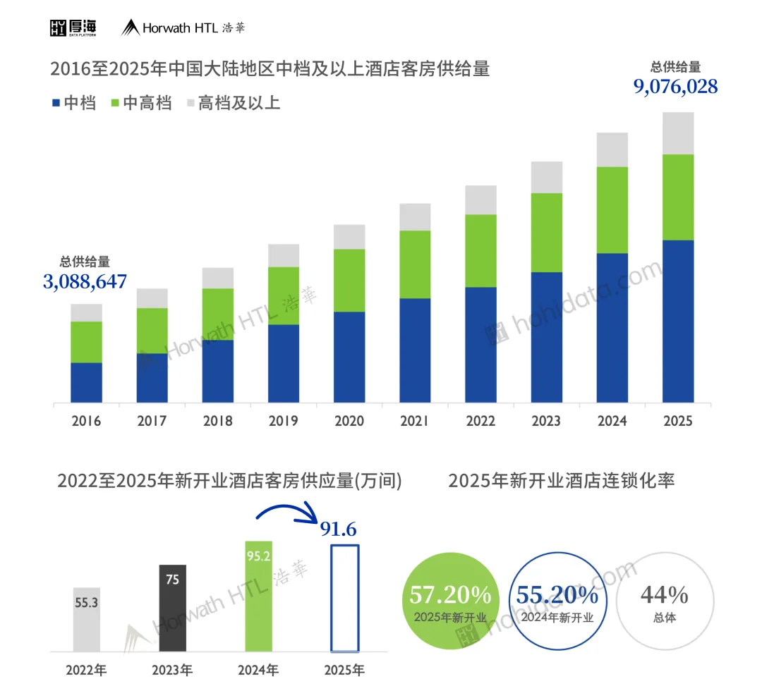 2025年,中国酒店市场供给端延续扩张趋势,并逐步进入以存量为主导的运行阶段。根据「厚海数据平台」统计,截至2025年末,大陆地区中档及以上层级在营酒店总数已达8.4万家,客房供给规模超过907万间,同比增速约为7.7%,大幅低于过往10年平均复合增速12.7%,增速水平达到过往10年历史最低点。