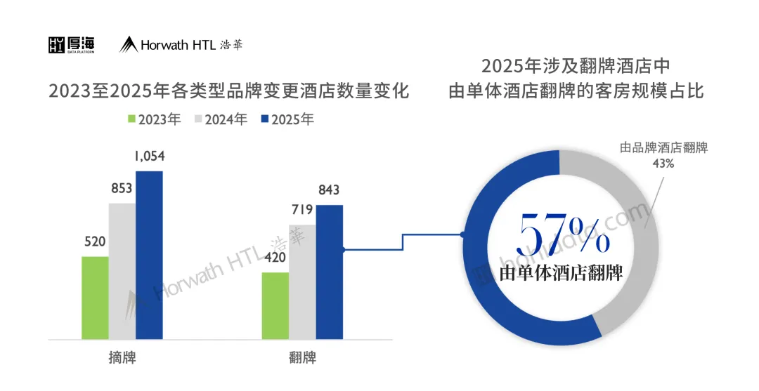 一方面,摘牌仍是品牌变更中的主要类型——全年共有1,054家酒店发生摘牌,涉及客房约10万间,占品牌变更客房规模的54%,与上一年基本持平。另一方面,翻牌数量则维持在相对高位——全年共有843家酒店经历翻牌,涉及8.4万间客房,占品牌变更客房规模的46%。其中,约524家原为单体非连锁酒店,翻牌后选择引入连锁品牌运营,占翻牌总客房数的57%。