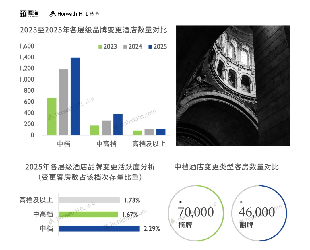 2025年,中国酒店市场品牌变更规模继续扩大。全年共录得1,897家中档及以上酒店发生品牌变更,涉及客房规模约18.4万间,同比增加16.5%。