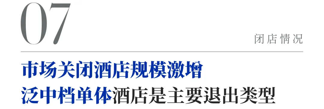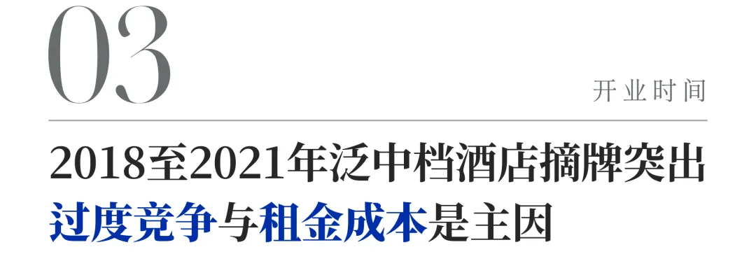 相较之下,2018至2021年开业的泛中档酒店则更集中呈现出摘牌趋势。这些酒店普遍在租金水平相对高位时期签约,当前已进入稳定运营周期。然而伴随产品和设施逐渐老化,面对层出不穷的泛中档新产品的集中入市,其业绩压力持续加大,盈利能力走弱,使得原有品牌体系下的成本结构难以为继,摘牌逐渐成为提升经营灵活性与缓解财务压力的主要手段。
