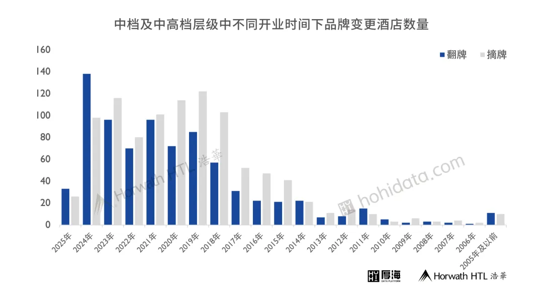 2022至2025年开业的泛中档酒店中,摘牌与翻牌数量相对接近。这些项目尚处在运营爬坡期,也是业主与管理团队的磨合阶段。随着培育期逐步结束,酒店经营状况逐步清晰,若整体表现仍未达到预期,部分业主会在合同节点前后重新评估合作模式,通过换牌或摘牌探索更适配的经营路径,以期改善现金流表现。