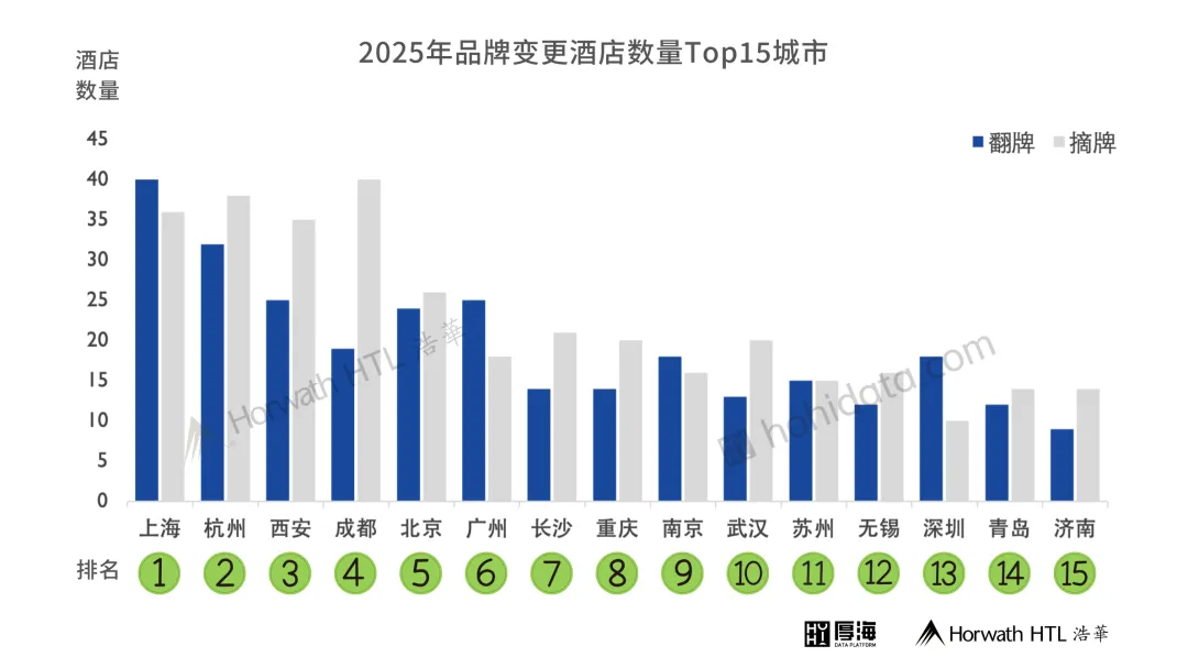 聚焦于重点城市市场可以看到,上海与杭州的品牌变更酒店数量分别为76家和70家,翻牌与摘牌数量相对接近,位居全国前列;深圳与广州的品牌变更以翻牌为主,显著高于摘牌数量;反观成都、西安、长沙、武汉与重庆等城市则以摘牌为主,成为品牌退出现象最为集中的区域。