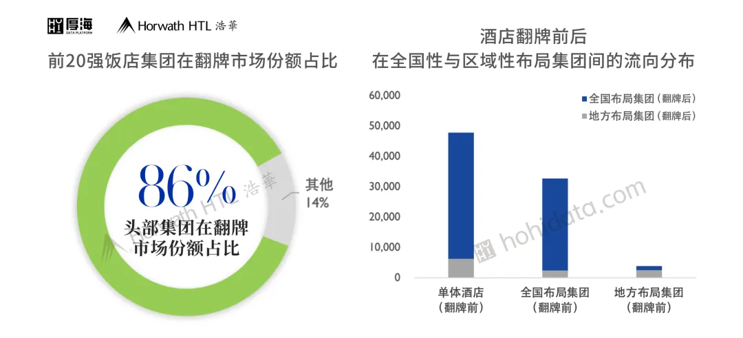 进一步从集团布局优势看,相较于地区布局优势集团*,全国性布局集团在存量竞争中展现出更强的品牌号召力。本年度统计中,翻牌后选择加盟全国性布局的品牌集团的客房占比达到88%。其中,原本隶属于全国性布局集团的酒店,在翻牌后仍有约93%继续选择全国性品牌,仅有约7%流向区域性品牌;而原属于区域性品牌的酒店中,约66%在翻牌后转向全国性布局集团。