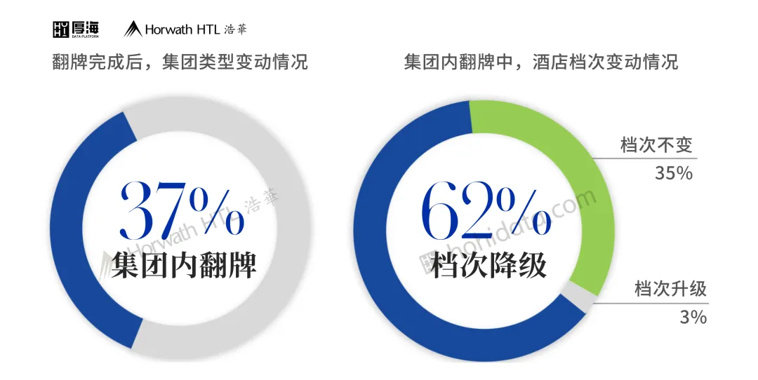 从结构上看,集团内翻牌以品牌档次下调为主。其中,约62%的酒店在翻牌后由原有品牌转向定位更低的品牌,档次持平的占比约35%,品牌上调的仅为少数个案。具体而言,集团内品牌下调主要由两方面驱动。