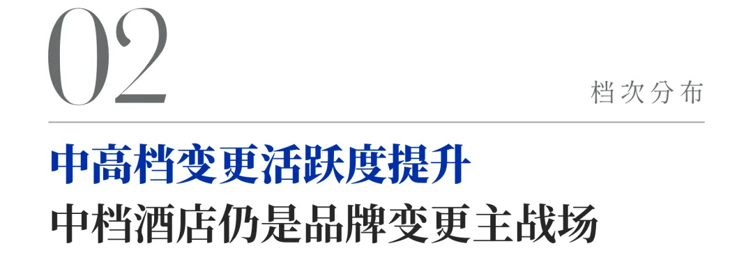 过去三年,中档及以上酒店品牌变更规模持续扩大,但不同档次的调整节奏出现分化——高档及以上层级变更规模相对稳定;中高档层级进入加速调整阶段,存量优化动能上行;中档酒店依然是品牌变更的主战场,摘牌现象突出。