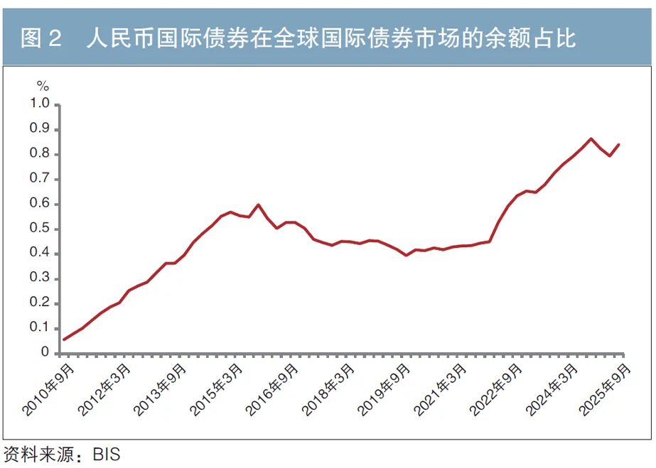 “十四五”期间点心债与熊猫债的发行规模分别约为4.62万亿元和0.72万亿元,居全球各主要金融市场人民币国际债券发行额的前两位,分别较“十三五”提升339.45%和80.63%。发行节奏加快带动点心债与熊猫债市场规模显著扩大。其中,点心债存量余额分别于2022年和2024年突破1万亿和1.5万亿元,熊猫债存量余额于2025年突破4000亿元。截至“十四五”末,点心债和熊猫债存量余额分别为19495.34亿元和4207.35亿元,分别较“十三五”末(2020年12月31日)增长275.43%和81.02%(见图1)。在点心债与熊猫债快速扩容带动下,人民币国际债券占全球国际债券市场份额显著增长。根据国际清算银行(BIS)的数据,截至2025年三季度末,人民币国际债券占全球国际债券余额的0.84%,较“十三五”末翻一番(见图2)。