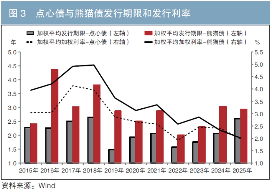 “十四五”期间,点心债与熊猫债的发行期限与发行利率有所波动。但从整体来看,二者的发行期限均呈现上升趋势,发行利率均呈现下降趋势。2025年点心债加权平均发行期限为2.6年(较2020年增加0.67年),加权平均发行利率为1.98%(较2020年下降0.69个百分点);熊猫债加权平均发行期限为2.94年(较2020年增加0.43年),加权平均发行利率为2.01%(较2020年下降1.12个百分点)(见图3)。