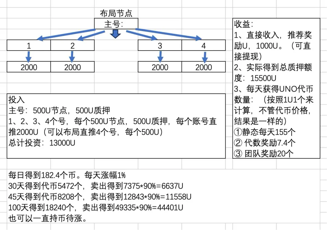 团队业绩 = 2000U(按照1U一个UNO计算,可得2个Uno)