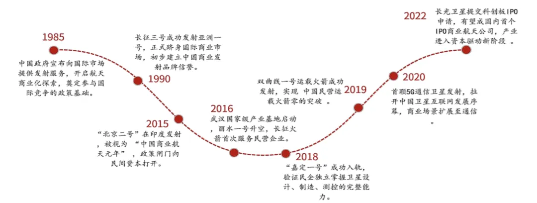 我国商业航天发展时间相对全球较晚。1985年10月,我国正式宣布长征系列运载火箭将投放国际卫星发射服务市场,承揽为国外发射卫星的业务。2015年7月中国政府核准的第一个民用商业遥感卫星“北京二号”在印度发射,2015年成为“中国商业航天元年”。从2019年星际荣耀成功发射“双曲线一号”遥一运载火箭开始,中国民营公司在商业发射领域也迅速崭露头角。