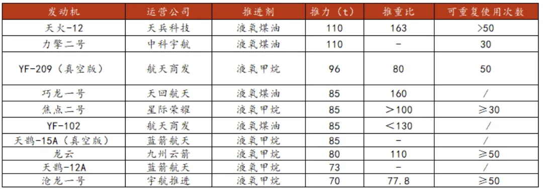 液氧甲烷具备突出优势,成为可重复使用火箭最优燃料选择。液氧甲烷火箭发动机具有理论比冲高、冷却性能好、不易结焦积碳、后处理快速便捷等诸多优势,适宜于作为可重复使用运载火箭的主动力,实现快速、可靠、低成本进出空间和大规模航天应用。从国内已公布的发动机参数看,液氧甲烷发动机在推力水平上已与液氧煤油相当,但凭借燃烧清洁、不易结焦的特性,普遍具备 30–50 次甚至更高的复用能力,大幅降低了维护和发射成本。同时,国内多家新兴航天公司均选择液氧甲烷作为核心研发方向,显示出其在未来商业火箭可复用化与高频发射趋势中的显著优势。