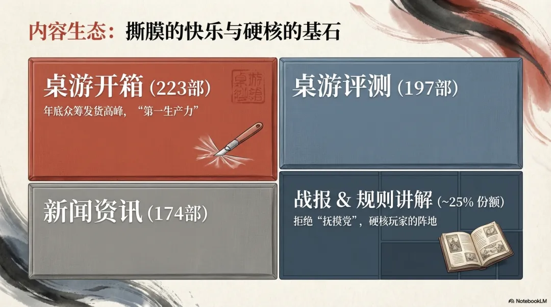 紧随其后的是【桌游评测】(197部)和【新闻资讯】(174部)。值得注意的是,【战报】 和 【规则讲解】 加起来占据了约25%的份额,这说明“硬核内容”依然是桌游区的基石——真正看战报的才是核心玩家。