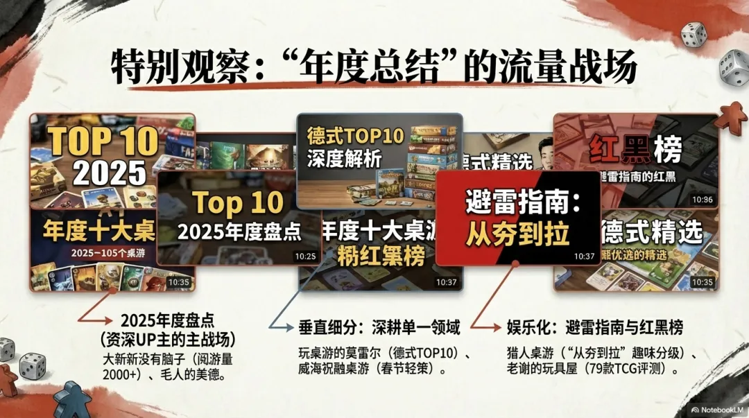 众多资深UP主选择在开年之际进行总结。大新新没有脑子的《2025年度桌游TOP10》强调了“阅游量2000+”的含金量;毛人的美德与养鸥人也推出了各自的榜单。