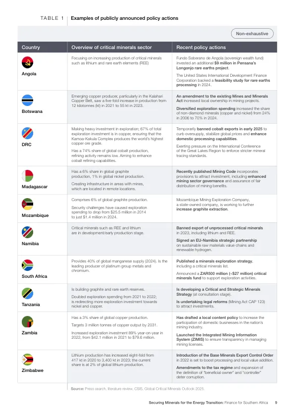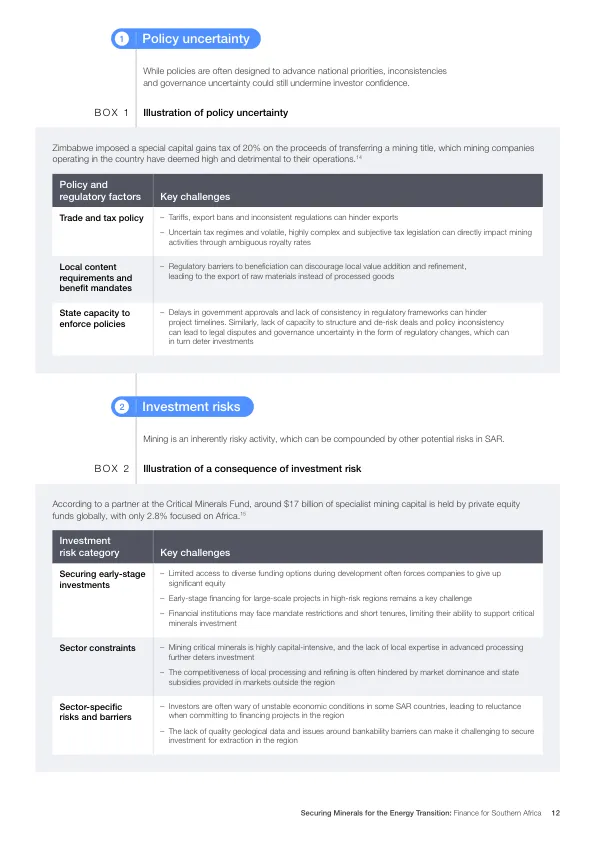 | 1. 政策不确定性 | 制定清晰、稳定的法规框架 | 赞比亚:通过新《矿业法》和中央许可委员会,简化流程,稳定税制,目标2031年铜产量翻两番。 |