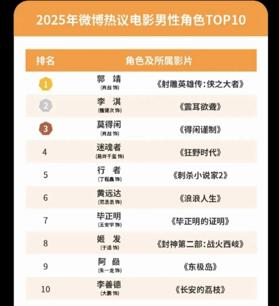 10.微博热议电影角色TOP.1及TOP.3:郭靖、莫得闲