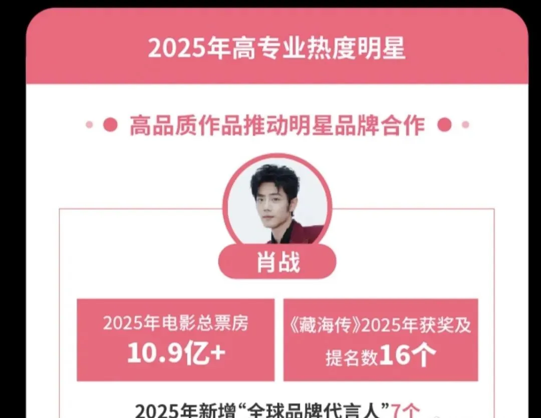 3.高专业度明星TOP.1(2025电影总票房10.9亿,藏海传获奖及提名16个,新增全球品牌代言人7个