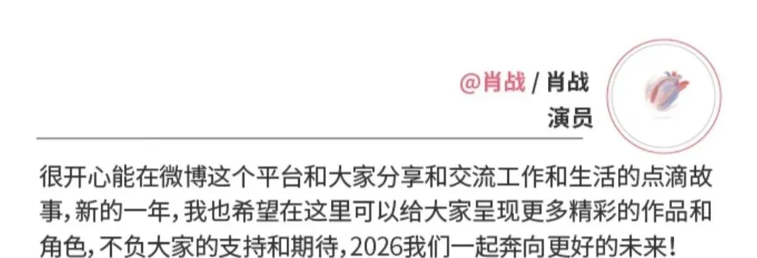 肖战:“很开心能在微博这个平台和大家分享和交流工作和生活的点滴故事,新的一年,我也希望在这里可以给大家呈现更多精彩的作品和角色,不负大家的支持和期待,2026我们一起奔向更好的未来!”