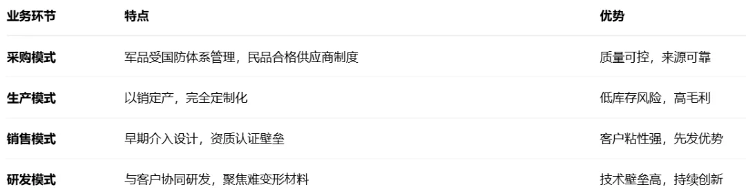 销售模式:公司采用"早期介入"策略,在产品设计阶段就与客户合作,通过参与行业协会会议和技术展览,与武器装备设计单位建立合作关系。一旦产品通过鉴定,公司即成为该型号装备的指定供应商,形成长期稳定的供需关系。