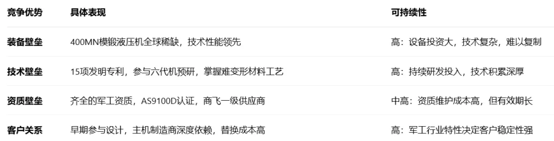 三角防务在高端锻件领域构建了深厚的护城河,主要体现在装备壁垒、技术优势、资质认证和客户关系等方面: