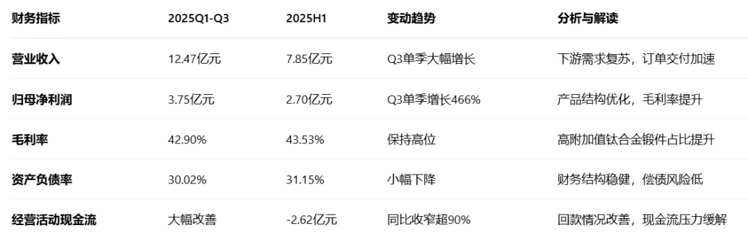 2025年是军品订单的复苏之年,主机厂去库存接近尾声,新一代战机产能爬坡将带动核心锻件需求回暖。公司2025年第三季度业绩已呈现V型反转,营收同比增长44.87%,归母净利润同比大幅增长466.32%,合同负债同比增长172%,订单已覆盖2026年全年产能,需求确定性强。