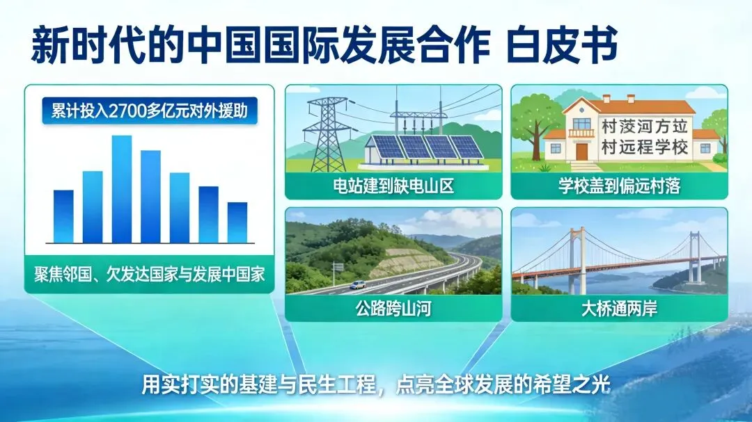 国务院新闻办《新时代的中国国际发展合作》白皮书,清晰勾勒出中国大国担当的清晰轮廓:累计投入2700多亿元对外援助,聚焦邻国、欠发达国家与发展中国家,把电站建到缺电山区,把学校盖到偏远村落,公路跨山河、大桥通两岸,用实打实的基建与民生工程,点亮全球发展的希望之光。