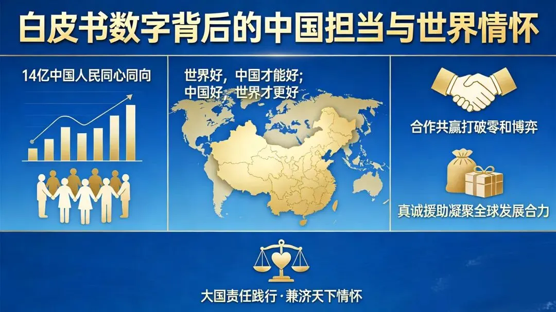 白皮书的数字背后,是14亿中国人民的同心同向。我们深知,世界好,中国才能好;中国好,世界才更好。在推动自身发展的同时,中国始终敞开怀抱、携手同行,用合作共赢打破零和博弈的陈旧思维,用真诚援助凝聚全球发展合力。这不仅是大国责任的践行,更是中华民族兼济天下情怀的时代彰显。