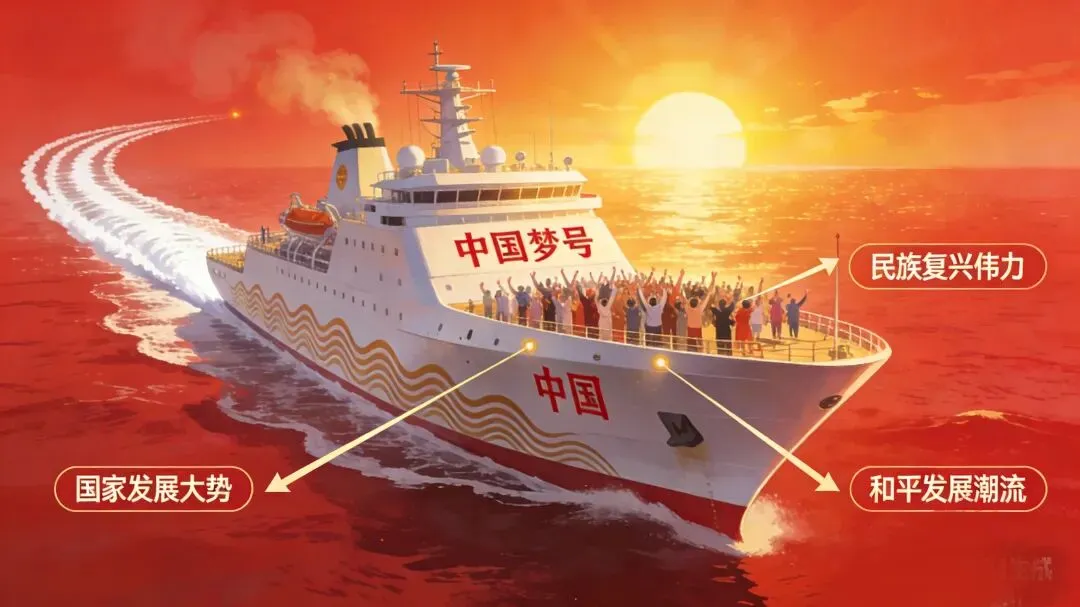 今天的中国,正以昂扬姿态屹立于世界东方。承载着亿万人民期盼的中国梦号中华巨轮,早已鸣笛启航。它的航向,由国家发展大势标定;它的动力,来自民族复兴的磅礴伟力;它的航程,顺应和平发展的时代潮流。