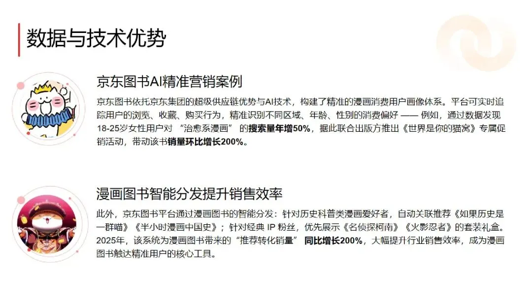 :京东凭借 AI 精准营销与智能分发,推动推荐转化销量同比增长 200%,与 95% 以上头部出版机构深度合作。小红书为内容种草主阵地,美食测评、场景化种草互动量高,商业投放同比增长 51.2%,美食与生活记录类头腰部达人效率突出;影漫联动、非遗工艺溯源、文创跨界为热门营销方向。