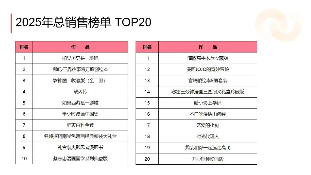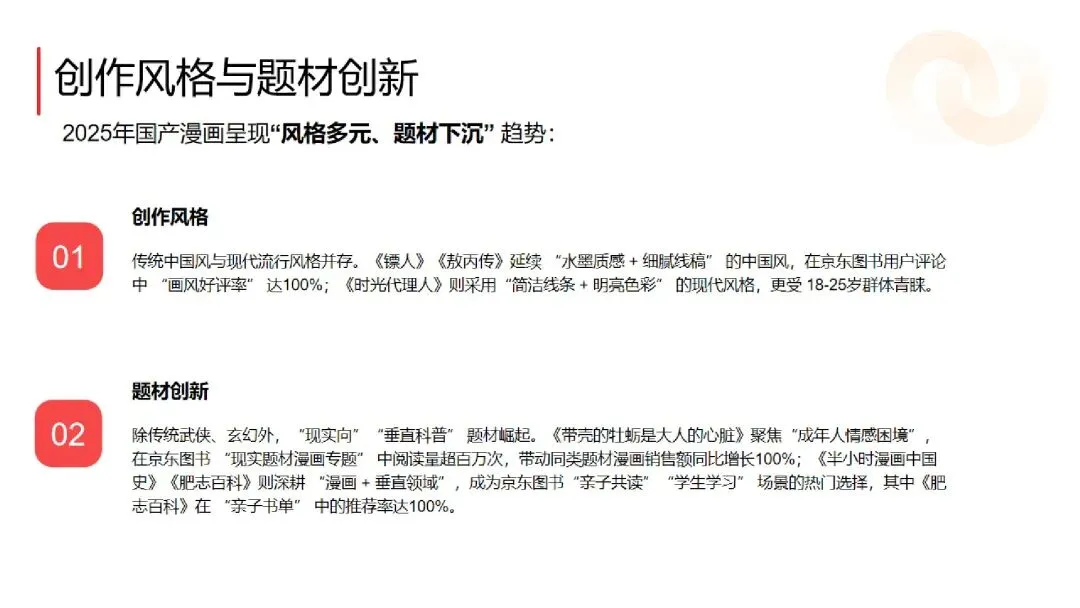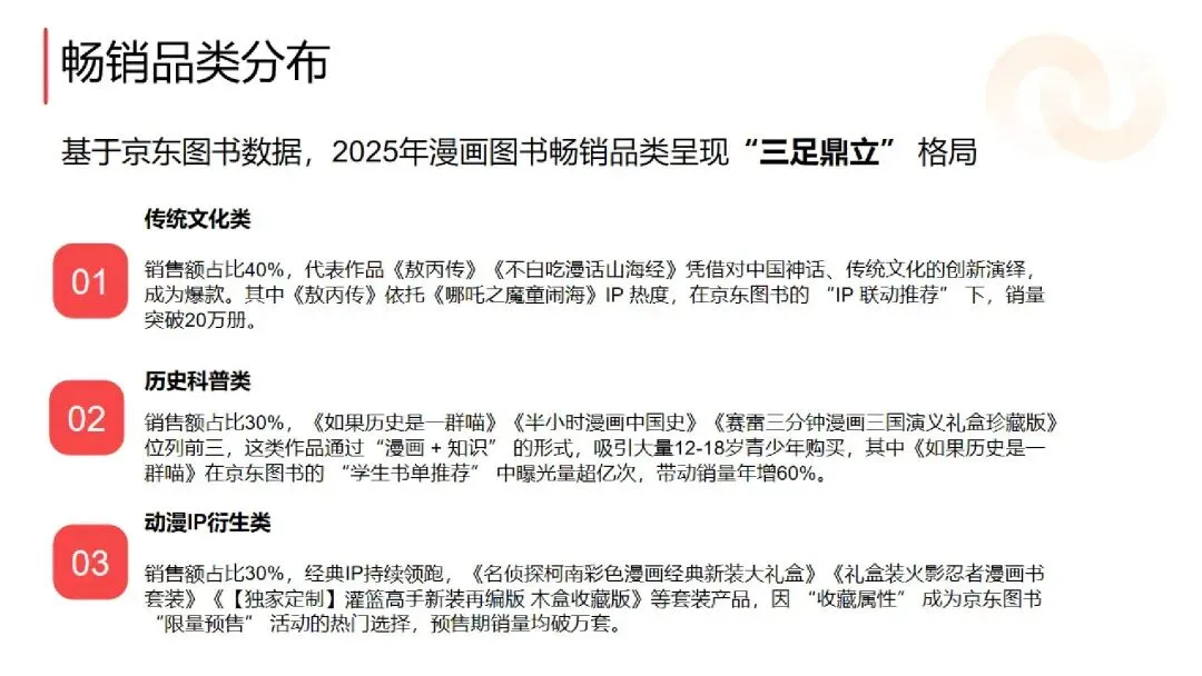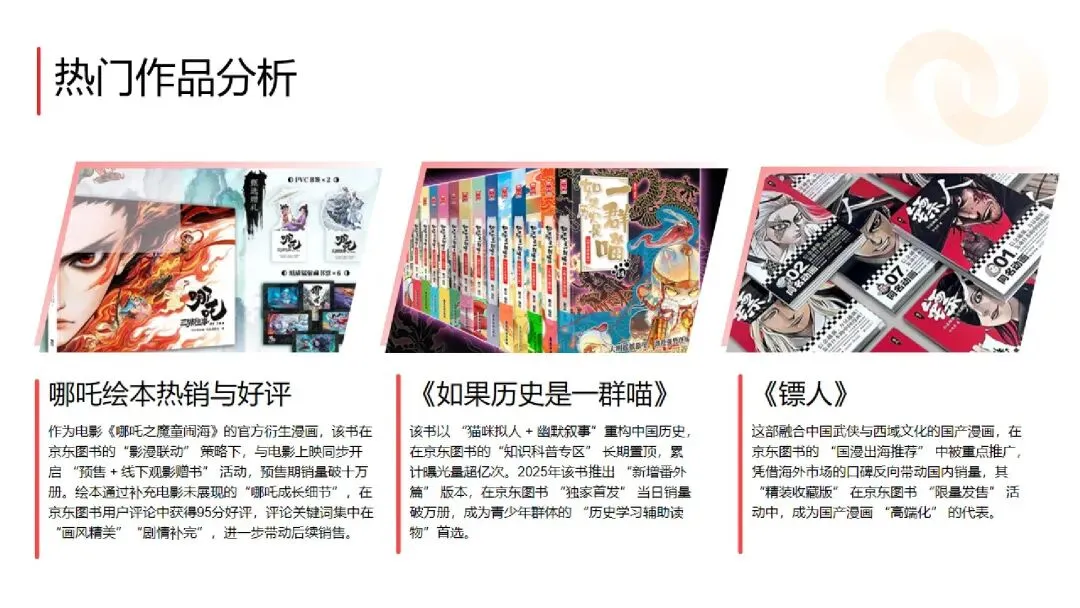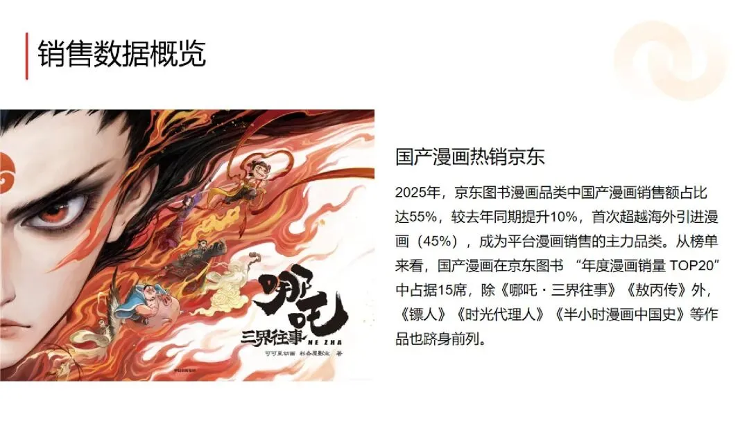 :2025 年京东平台漫画图书销售额同比增长 60%,远超图书行业整体水平,单册销售额破百万的产品达上百种。《哪吒・三界往事》《敖丙传》等影漫联动作品销售码洋破亿,《鬼灭之刃》《如果历史是一群喵》等 IP 衍生或科普类作品稳居畅销榜,Q2(假期 + 618)与 Q4(双十一 + 年终囤书)为销售旺季,合计占比超 60%。 - 国产漫画崛起,首次超越海外引进