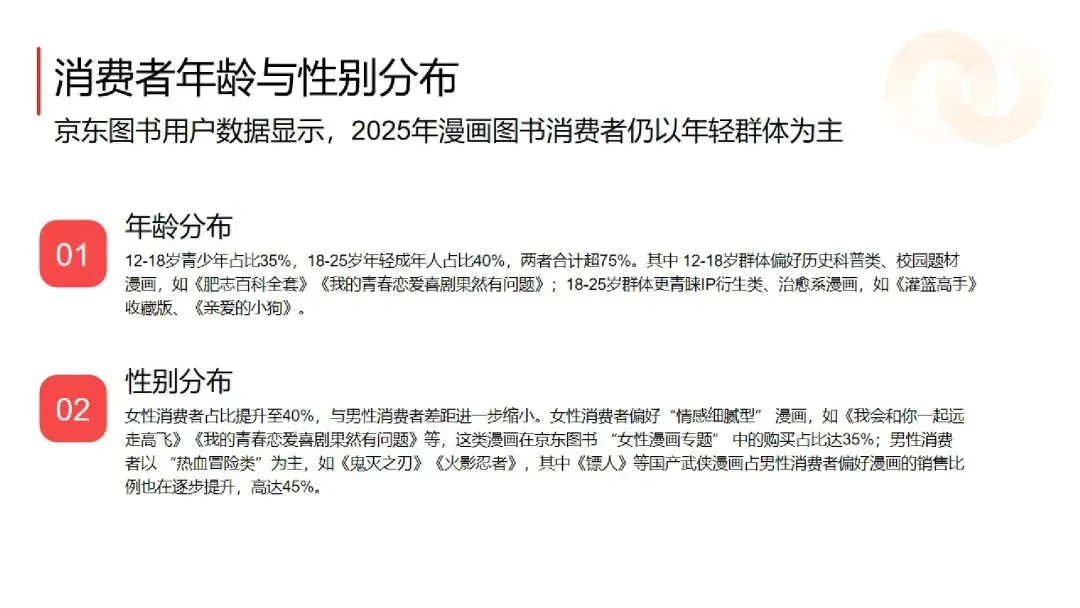 :12-25 岁消费者占比超 75%,12-18 岁偏好历史科普类(如《肥志百科》)与校园题材,18-25 岁青睐 IP 收藏版与治愈系漫画。女性消费者占比提升至 40%,偏好情感细腻型作品;男性以热血冒险类为主,国产武侠漫画占比达 45%,性别需求差距持续缩小。 - 品类呈 “三足鼎立”,收藏级成新增长点