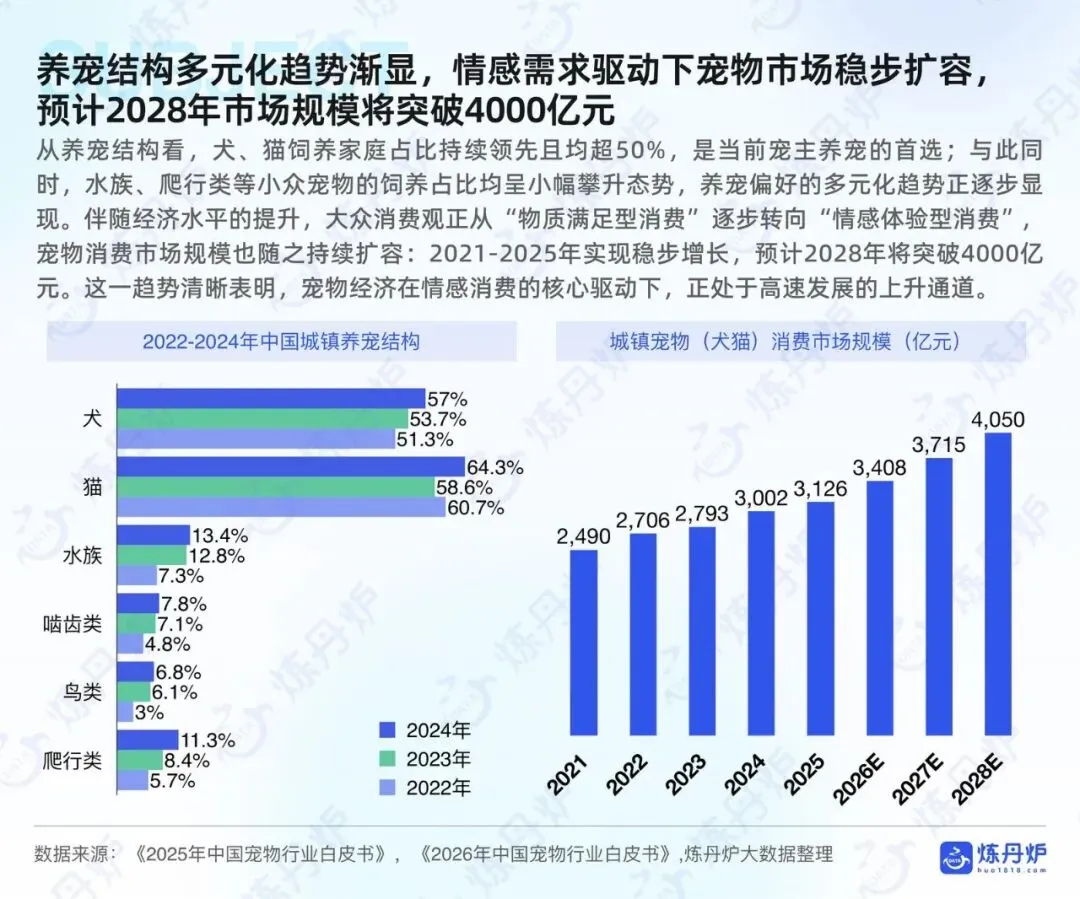 《2026年中国宠物行业白皮书》由杭州知衣科技有限公司及其旗下炼丹炉大数据系统联合发布,全面剖析了中国宠物市场的最新动态、消费趋势与未来机遇。报告指出,在情感消费的强劲驱动下,中国宠物经济正从基础喂养迈向价值驱动的精致养育新阶段,预计2028年市场规模将突破4000亿元。