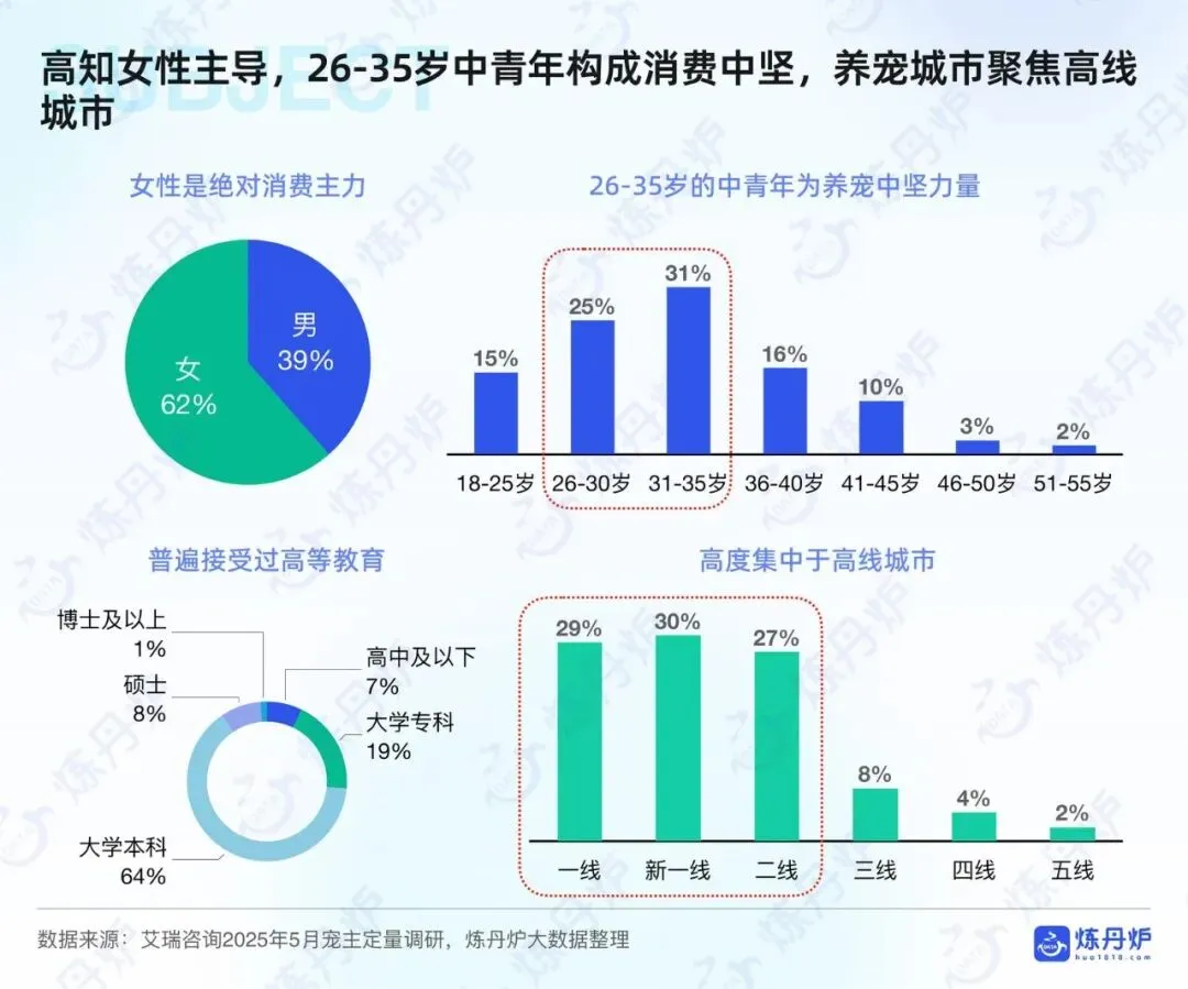 宠物消费主力人群特征鲜明。女性是绝对消费主力,占比62%。26至35岁的中青年是养宠中坚力量,普遍接受过高等教育,且高度集中于一线及新一线城市。从职业与家庭结构看,经济稳定的白领阶层是核心群体,家庭多为3至4口的有孩家庭,九成以上宠主具备可持续的消费能力。