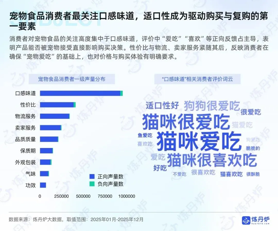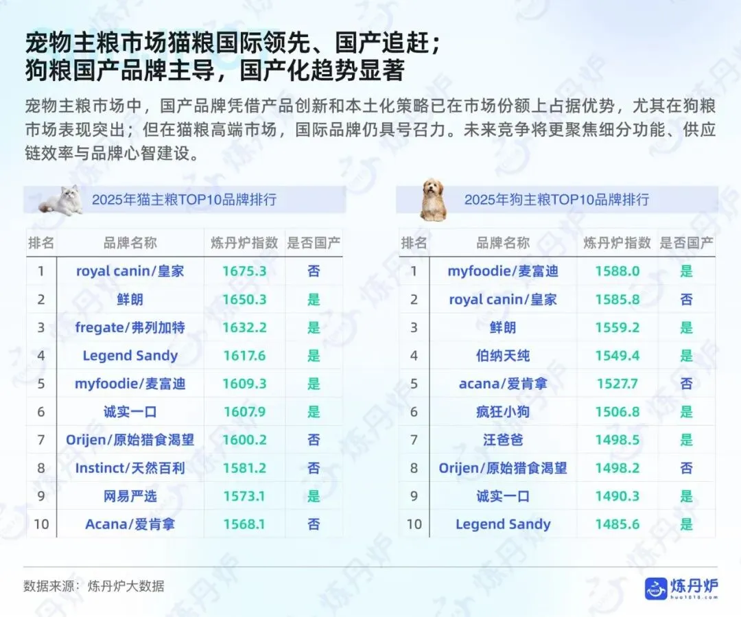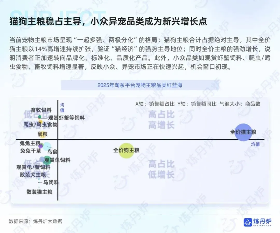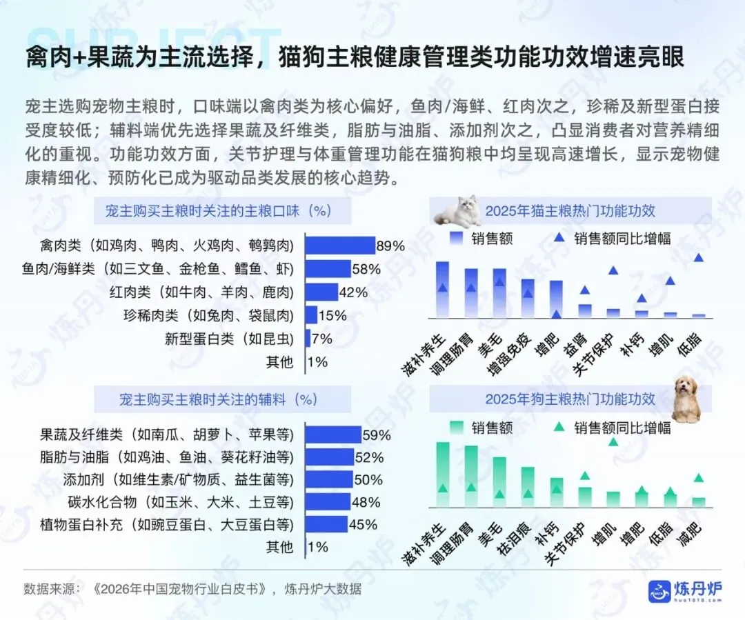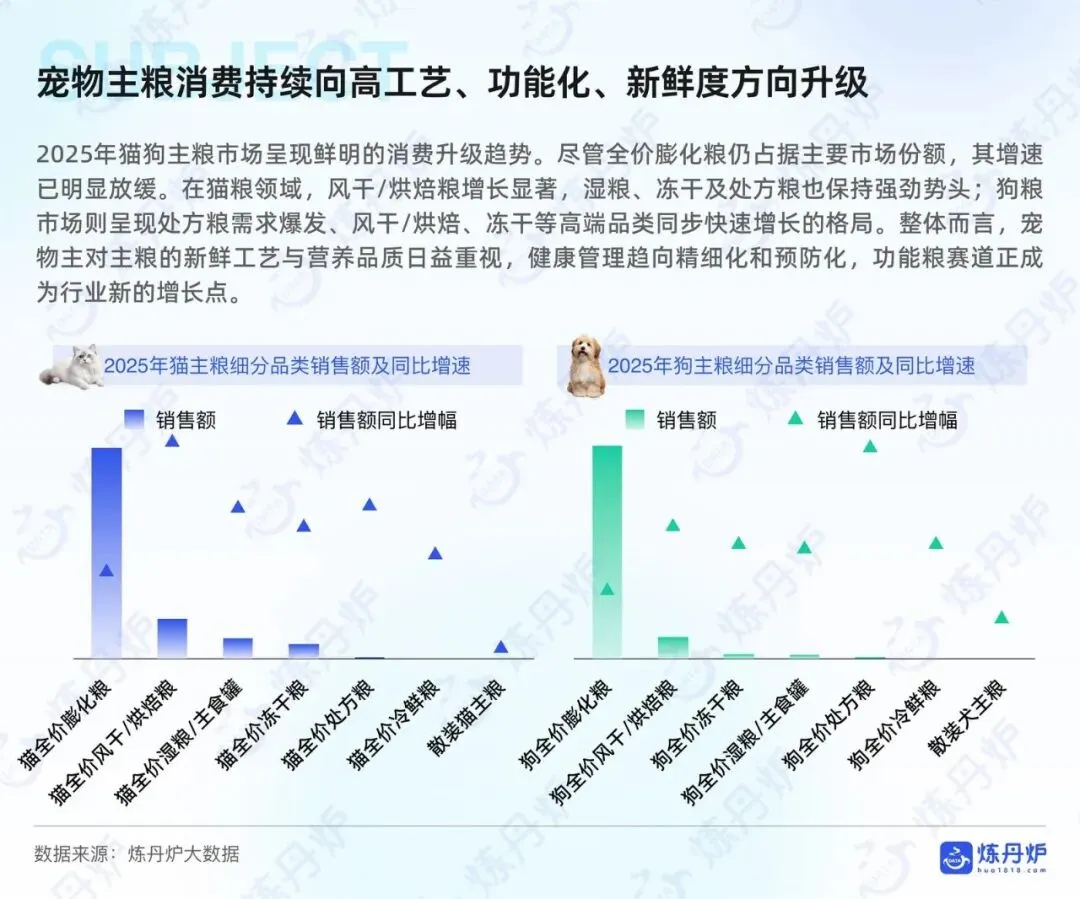 宠物消费正从基础的生存型喂养,迈向以场景体验和健康预防为核心的价值驱动型精致养育。市场呈现食品与用品双核主导的结构。在主粮领域,消费升级趋势明显,全价风干烘焙粮、冻干粮、处方粮等高端及功能化品类增长强劲。老年期专用粮成为增长亮点,反映出宠物老龄化带来的定制营养需求。零食市场则加速向主粮级工艺看齐,功能化趋势显著,消化健康成为犬猫主人共同关注的焦点。